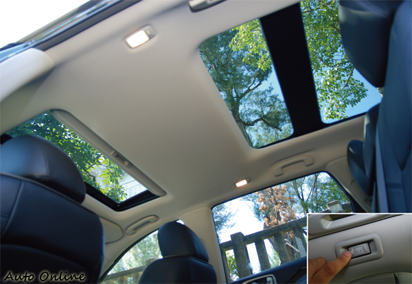 ▲雙扇全景天窗是AWD車型獨享配備,後面的天窗玻璃雖然無法打開,不過也能提供明亮的車室照明。