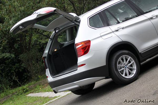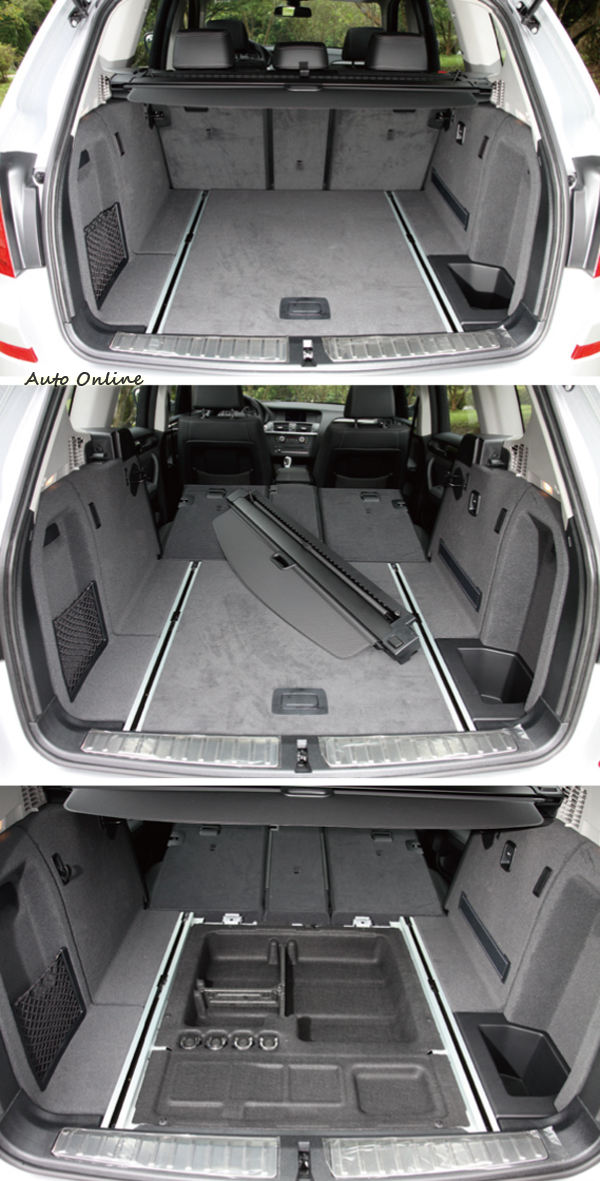 置物空間絕對是購買SUV考量因素之一,X3後置物容積有550L,透過後座椅背40:20:40的傾倒功能,瞬間增加為1,600L。在後車箱底板下設有隱藏置物空間,並附有安全隔網以防物品晃動,也能利用地板上的滑軌來固定物品,擁有強大的RV機能。
