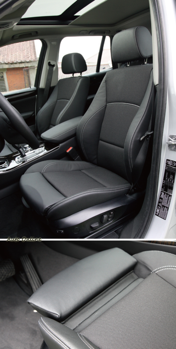 BMW在內裝用料一點都不馬虎,大量運用軟質塑膠,並搭配押花高質感飾板,造就X3車室時尚優雅的座艙氛圍。中控台操作介面簡單乾淨,並沒有過多複雜的操作按鍵,最基本的冷氣、音響控制按鍵設置在中控台面板上。其它較為詳細的車輛控制統一歸納在iDrive選單裡,駕駛透過中央扶手前方的旋鈕搭配中控台上方的全彩螢幕,輕鬆找到想要調整會進入的選單內。比較可惜的是X3 xDrive20d為X3入門車型,並未配置原廠中文化衛星導航,消費者如果想要愛車能有原廠功能強大的衛星導航,可以加價選購。