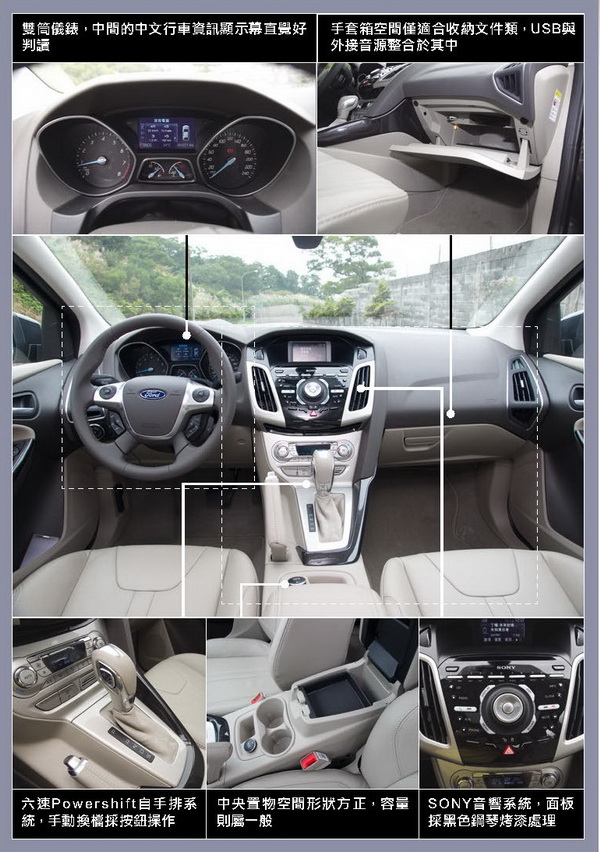 另外,這次新Focus的重要賣點之一,就是原廠投入相當多資源開發的SYNC中文通訊娛樂整合系統。透過USB或藍牙來與USB隨身碟、i-Pod、MP3播放器、行動電話等裝置連結後,就可以直接用聲控方式來操作音樂播放或撥打電話。操作方法就是按下方向盤右邊的撥板,聽到提示之後說出語音指令,例如「播放演出者+(某歌手)」、「播放歌曲+(歌曲名稱)」、「撥打電話+(對方姓名)」等等,系統就會去做播放音樂或是撥打電話的動作,不過如果是透過藍牙連結,就沒有搜尋專輯名、曲名播放的功能,只能操作播放、暫停等基本功能。