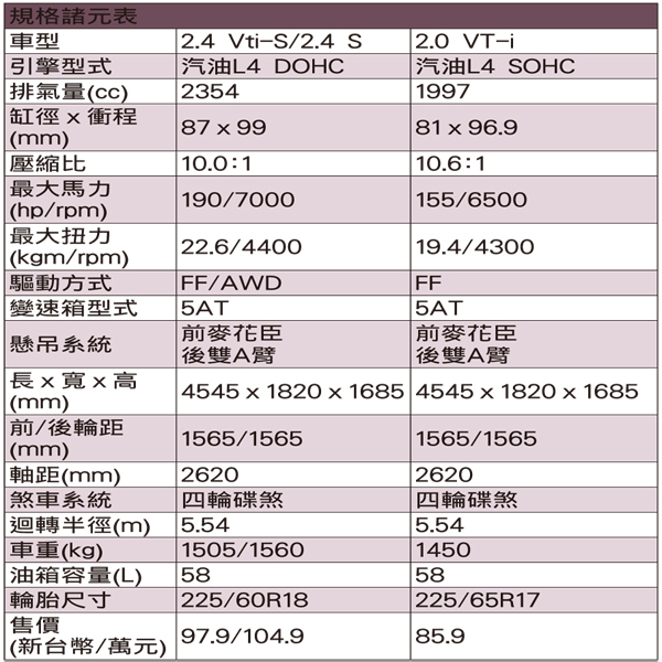 動力傳動的差異![]() ▲2.0 VTi的動力比預期好很多,油門反應迅速而輕快是最大的優點。本次提供2.0L及2.4L兩種動力選擇,其中讓我們感興趣的當然是擁有190ps最大馬力的2.4L全新引擎。然而從規格上來看,這具引擎必須將轉速拉到7000rpm與4400rpm,才可分別獲致峰值馬力及扭力,對於休旅車而言,這樣的設定與原本的預期有些落差,在實際的試駕過後,更發現傳動系統的差異,造成的影響比想像中大。 ![]() ▲AWD僅在頂級車型才提供,不過國內買家多半只對2WD車型感興趣。換上前輪驅動的2.4 VT-S再出發,立即感受到暢快的加速感!原以為CR-V的AWD只是“備用”設計,在一般平路上應該不會有太大差異,不過看來並非如此。在同樣乘載的人數前提下,2.4 VT-S明顯提速反應更好,也不需要刻意拉高轉速,就能獲得不錯的動力表現,這結果有點讓人驚喜。 ![]() ▲全車系都獲得能源效率一級的油耗表現,加上大馬力的引擎動能,動力成為CR-V的一大賣點。其實這一代車型更強調油耗的改進,但SUV怎說都很難比轎車省油,加上實驗室中測得的高速耗油量並不考慮風阻,這方面和實際表現往往差更大。以經濟部公佈數據來看,2.0L的12.8km/L均耗、2.4L前驅版的11.7km/L、2.4L 4WD車型的11.0km/L,已經足以讓CR-V全車系都取得能源效率標示第一級,已經是相當不錯的表現了。