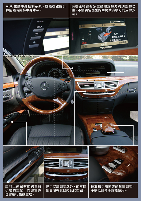 ![]() 關上車窗後,整個車室隨即進入另一個世界,這種寧靜的空間並不是令人屏息的無聲,而是將吵雜的噪音隔絕,雙耳依然依稀可聽見引擎聲,不知是否錯覺,行經不良路面時的悶哼聲,甚至必須轉速拉高超過三、四千轉以上,V12引擎的特殊聲浪才會開始傳入車內,而且似乎不論駕駛方式多麼粗野,傑出的主動懸吊都能震動與頓挫柔化。還記得不久前在賓士駕馭體驗營中駕駛S600 L,在緊急閃避的項目中因為車速過快與操作不當而讓整輛車失控,整部車都已經側滑橫移甩出去,當時身體卻只是晃了一下,還搞不清楚發生什麼事,可見這套懸吊的效果有多驚人。