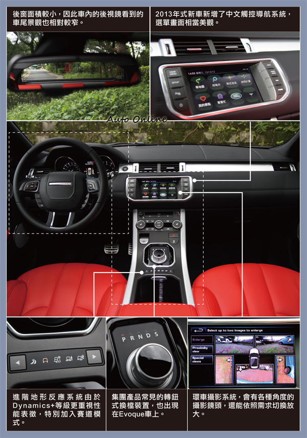 ![]() 首先要說明的是,這次所試駕的Evoque,它的完整車名其實相當長:「2013 LAND ROVER Range Rover Evoque 2.0 Si4 Dynamic+」,所以接下來這裡只會用Evoque直接稱呼。由於這次Evoque上市時間不算長,沒有必要進行大幅度的改款工程,因此只在細節與配備上更動,不過其中一個變更的地方,卻是它的廠徽。原來當初Evoque開賣前,原廠就有意推出全新的品牌策略,也就是把RANGE ROVER車系獨立出來,改走高級化經營品牌的概念;因此在Evoque車上特別使用「RANGE ROVER」的橢圓商標,而不是一般常見的「LAND ROVER」。不過後來這項計畫因故擱置並沒有實施,因此在新年式的車型,熟悉的橢圓LAND ROVER商標又回來了。