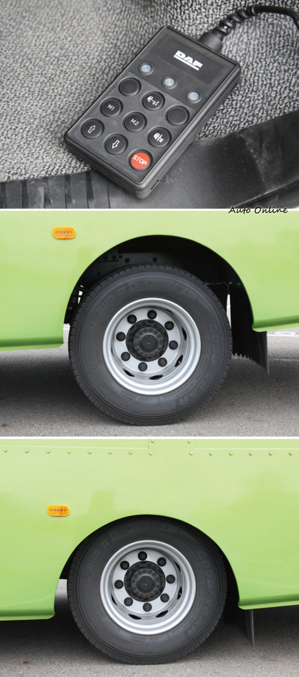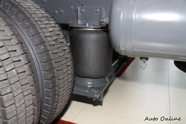 ▲後軸有升降功能,高低變化的幅度不小。此舉可方便貨車上下貨。