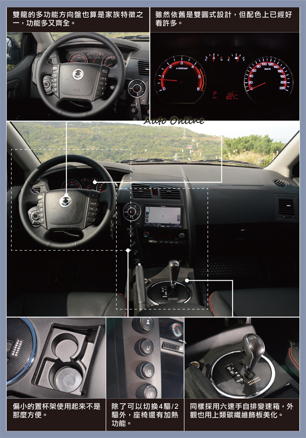 行駛在濱海公路最大的感想就是車子更穩也更安靜了,在關門時聽到厚實的關門聲似乎就在告訴我們這台韓國車不一樣了!以前讓人感覺做事做一半的劣質感在New Actyon Sports也感受不到。良好運轉品質、適中的懸吊設定都讓人不得不對雙龍的進步給予肯定。如果要扣分,我應該就剩價格跟品牌形象吧!