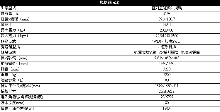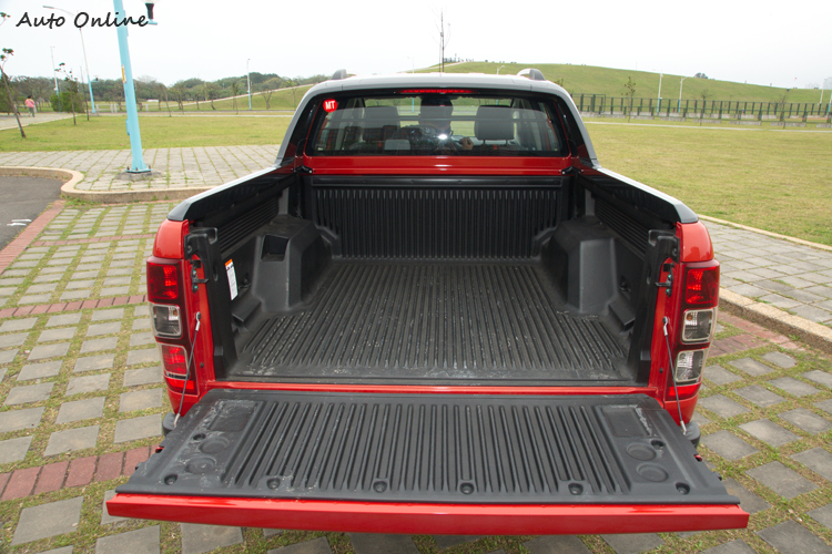 而在車尾,也就是貨卡車最重要的貨斗部分,整合了後霧燈的類梯形尾燈組面積大,從後方非常好辨認。車廠有提供上質感不錯的高耐磨護板來保護貨斗內的物品和防止雨水,不過這次的試駕車並沒有配備。配胎則是265/60呎碼的搭配18吋鋁圈。