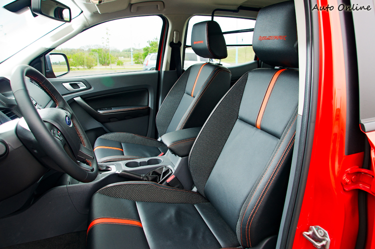 身為「多功能新世代運動休旅」,新Ranger的內裝基本上是比照SUV運動休旅車的水準。中控台部分有類碳纖維飾板、排檔以銀飾板裝飾、門內把手則用鍍鉻亮銀處理,方向盤則以有橘色縫線的真皮材質來包覆。而在配備上,Wildtrak造型座椅為皮革與織布混搭,駕駛座具八向電動調整與手動腰部支撐調整功能。