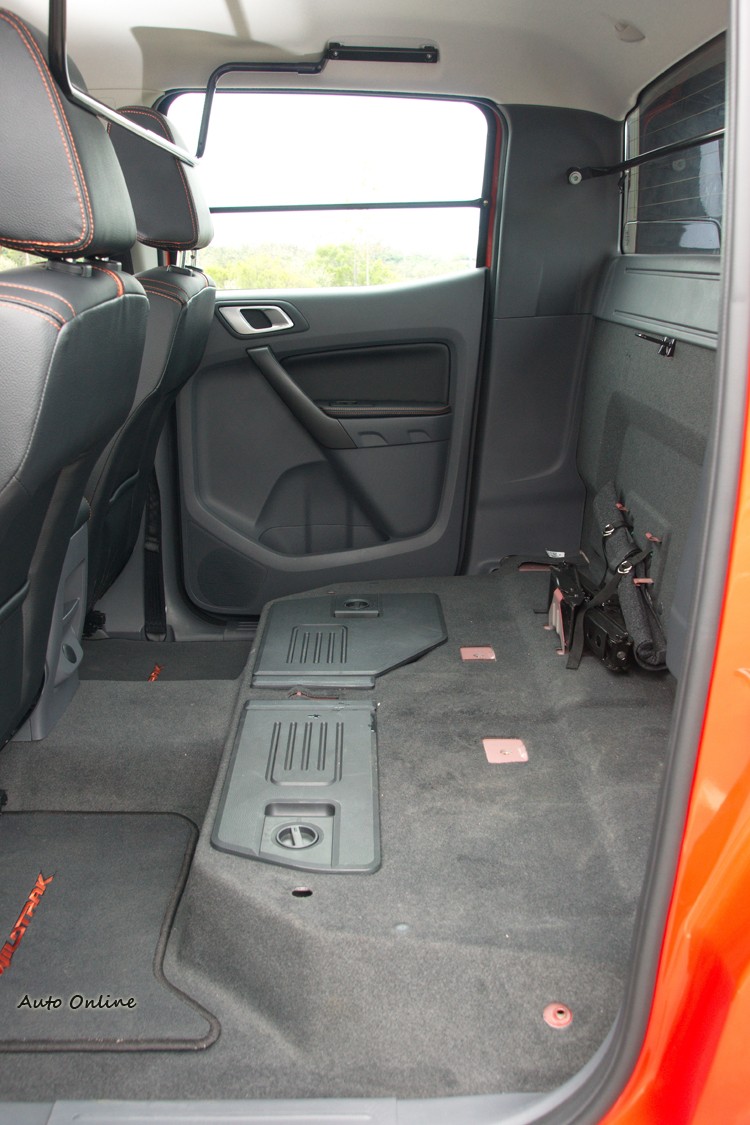 新Ranger車長超過五米、車寬超過一米八,可以想見空間絕對是它的強項。置物收納空間都是大而方正,例如手套箱足足可以放進一部16吋的筆記型電腦,車門邊的置物槽可以輕鬆放進2.0升的飲料瓶,中央扶手內的雙層式置物箱不但空間大還具有空調保冷出風口,連後排地板都有隱藏置物區可以放些小工具之類的。