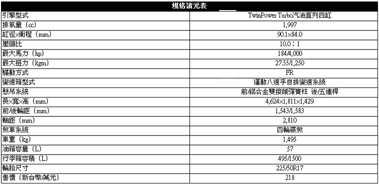 小排氣量加渦輪成為新趨勢![]() ▲BMW 3系列Touring原廠標準搭配Sport Line,在車身外觀飾條走的是運動年輕氛圍,消費者也能自行選配不同風格樣式。汎德汽車引進台灣的BMW 3系列Touring有兩種動力、四種引擎,分別為柴油引擎318d、320d以及汽油引擎320i、328i,汎德汽車將Touring車系統一搭載Sport Line套件,套件包含後視鏡外蓋、方向盤紅線處理、黑色高光澤水箱護罩、前後保險桿光澤飾條、黑色高光澤排氣飾管、BMW Sport字樣前門門檻等…運動氛圍套件,而這次試駕的車型為320i Touring。 ![]() ▲雙輻式代號392的17吋鋁圈,對於車身比例修長的Touring來說,有點大人穿小鞋的感覺。![]() ▲320i Touring搭載一顆2.0L的直列四缸汽油渦輪增壓引擎,爆發出最大馬力184hp/5,000rpm,最大扭力設定在27.55kgm/1,250rpm。![]() ▲Steptronic運動化的八速手自排變速箱也是讓320i Touring在加速表現上亮眼的一大功臣。![]() ▲Touring在B柱之前與Sedan車型設計一模一樣,最大差別在於B柱之後,旅行車的外觀增加後行李廂的置物空間。