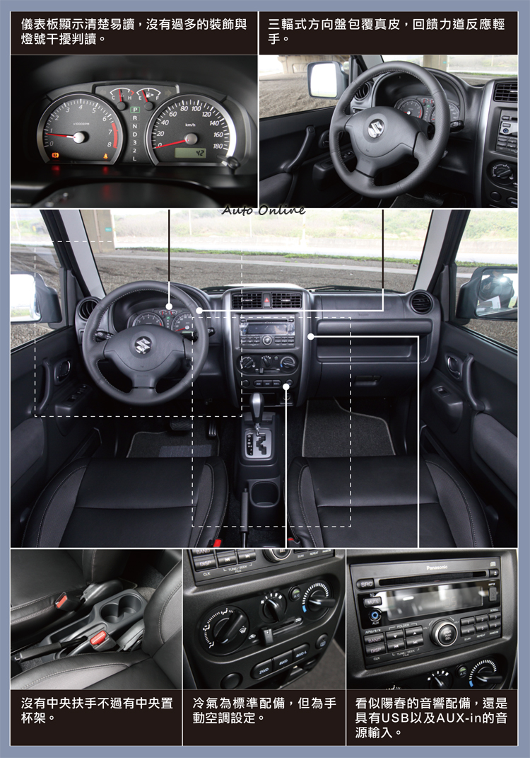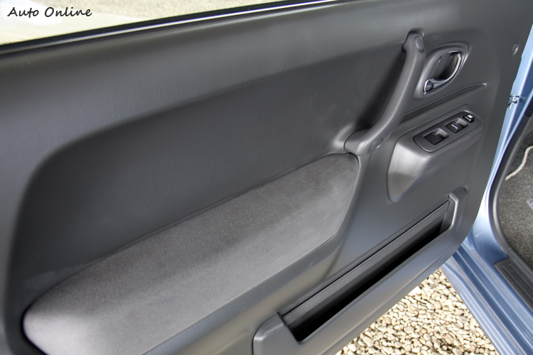 ![]() ▲Jimny有多元化的置物空間,不用擔心東西沒地方放。![]() ▲車門扶手刻意搭配麂皮布料來增加車內質感。![]() ▲兩張手動調整前座椅,真皮材質比絨布好清理。