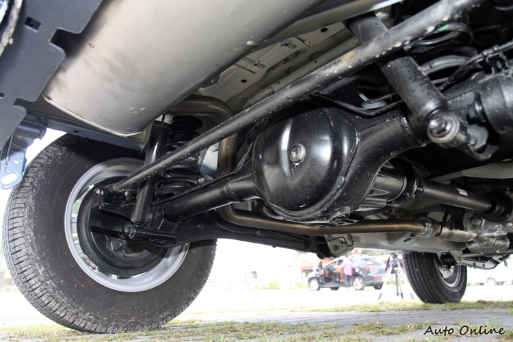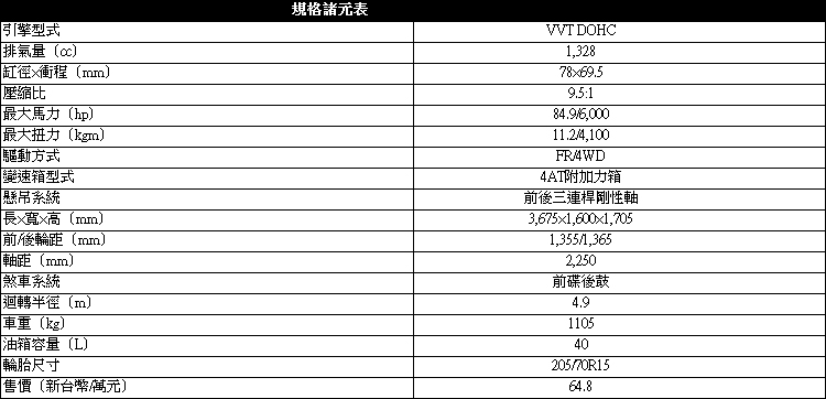 動力表現非強項![]() ▲Jimny搭載VVT 1.3L M13A DOHC引擎,在電子多點燃油噴射機構輔佐下,最大馬力84.9hp/6,000rpm與最大扭力11.0kgm/4,100rpm動力上,搭載VVT 1.3L M13A DOHC引擎,在電子多點燃油噴射機構輔佐下,最大馬力84.9hp/6,000rpm與最大扭力11.0kgm/4,100rpm;變速箱使用四速自排變速箱附加力箱,在中控台上可以切換2WD、4WD以及4WD-L,透過中央差速器的分配,Jimny能有效平均分配四輪的抓地力。 ![]() ▲搭載高剛性H型底盤大樑,前、後使用三連桿剛性軸式懸吊,結實的梯型設計能適用各種越野路況。![]() ▲Suzuki Jimny原廠搭配的是205/70R15的一般街胎,刻意誇張的輪拱採用塑料避免板金刮傷。