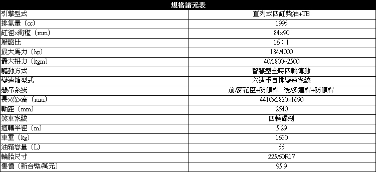 ▲柴油引擎本體加上4驅讓車重來到1630公斤,但綜合油耗表現仍有12.9km/L的水準。