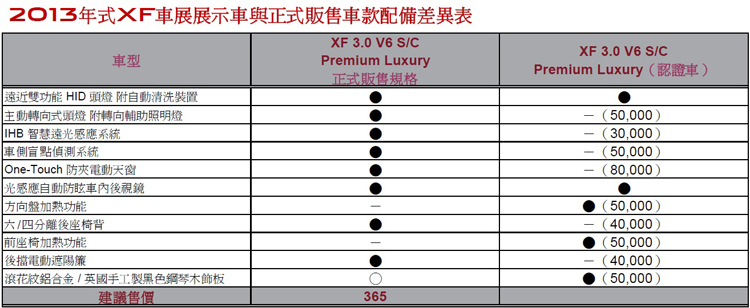 這次XF主要的變動在於汽油引擎動力的導入,因此外觀上變化幅度相當輕微,不細查幾乎很難分辨。13年式的XF在保桿下方左右兩處進風口處做了鍍鉻飾條處理,而保桿下緣的橫柵也稍稍往上提,屬小針美容等級的改變。