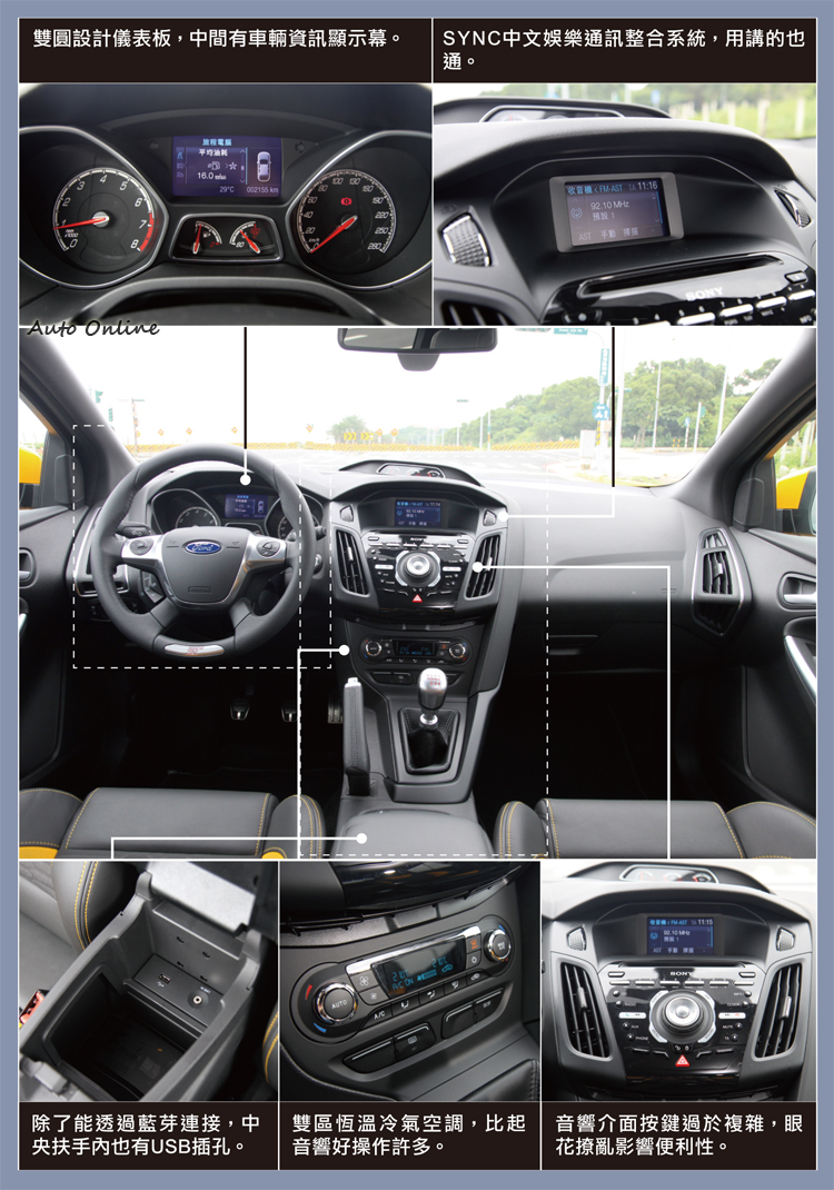 車內中控台的設計與一般FOCUS一模一樣,一樣配置SYNC中文娛樂通訊整合系統,由中控台上方的螢幕讀取車輛資訊。