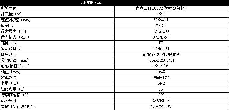 2.0L渦輪增壓引擎+六速手排設定
