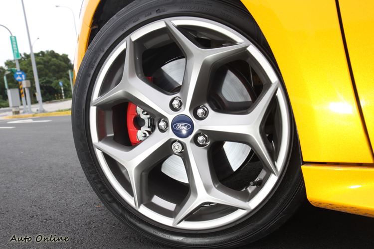 在底盤的調校上,底盤結構與一般FOCUS一樣,但是針對避震器桶身阻尼與彈簧磅數做等級上的提升,讓駕駛者在激烈操駕時不自於出現軟腳。另外,方向機的設計是這次FOCUS ST最厲害的地方,透過方向機逐漸放大的齒比,達到方向盤總圈數只有1.8圈,意思就是左、右轉方向盤只有0.9圈,這樣的設計來自於賽車上,有點類似一比一的轉向,讓FOCUS ST開起來非常靈活。