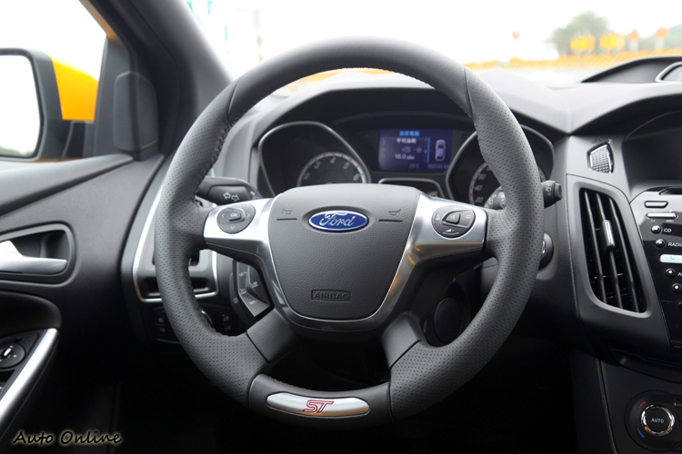 ▲方向盤直徑稍大,下方有ST專屬銘牌。