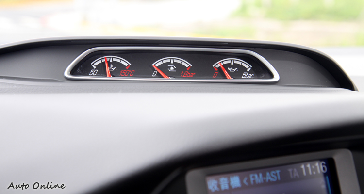 FOCUS ST為了突顯該有的駕駛熱血分子,在中控台上方增加三環表,從左到右分別為機油溫度、渦輪增壓與機油壓力,駕駛能隨時監控引擎狀況,不會因為開得太忘我而造成終身遺憾。