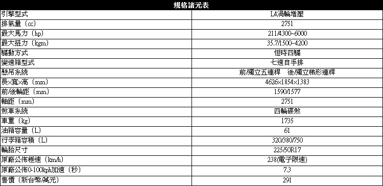 台灣不像部分歐洲國家採馬力課稅,我們稅賦等級取於排氣量的多寡,因此改由2.0升渦輪增壓引擎另一項好處就是稅金可以低一些。很多人會質疑事情總是一體兩面,當排氣量少了,稅金省了,那動力輸出是不是也打折了?