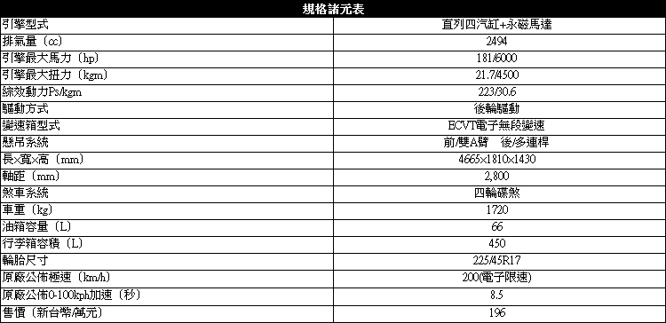 ![]() ▲複合動力綜效馬力有223ps,靜止加速到100km/h需8.5秒。動力上IS 300h搭載一顆直列四缸的自然進氣引擎(代號2AR-FSE)與兩顆永磁電動馬達,提高D4-S缸內直噴壓力,得到更好的馬力輸出與油耗。純引擎最大馬力為181ps/6,000rpm,最大扭力22.5kgm/4,200~5,400rpm,如果加上電動馬達的動力綜效馬力有223ps,綜效扭力高達30.6kgm,靜止加速到100km/h花費8.5秒。變速箱使用一顆ECVT電子無段變速箱(可模擬六速換檔模式),Hybrid系統搭載ECVT變速箱已經成為LEXUS不變的定律,但是這顆ECVT無段變速箱,缺少自主控制的設定,就算手動換檔,顯示的檔位也只是最高檔位,並非固定檔位。