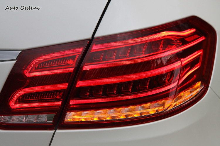 小改款的E-Class動刀割除了大小眼間的隔絕,而出現一對鳳眼,但仍運用LED導光條勾劃出類似遠近燈分離的模樣,所以看起來還是四頭燈的設計,勉強也算是維持了車系四燈傳統。新的一體式頭燈當然更好運用造型,所以原廠乾脆給不同車型與等級不一樣的燈組設計;新導入的全LED智慧型頭燈還具有主動轉向、遠燈自動調適功能,不怕車燈會刺瞎對面來車的眼睛,而且LED導光條的位置和型式也有好幾種。車尾改變不多,但尾燈組全面LED化,尾燈四道導光條在夜間相當醒目,隱約還能看出是「E」字形,看過一次就很難忘記。