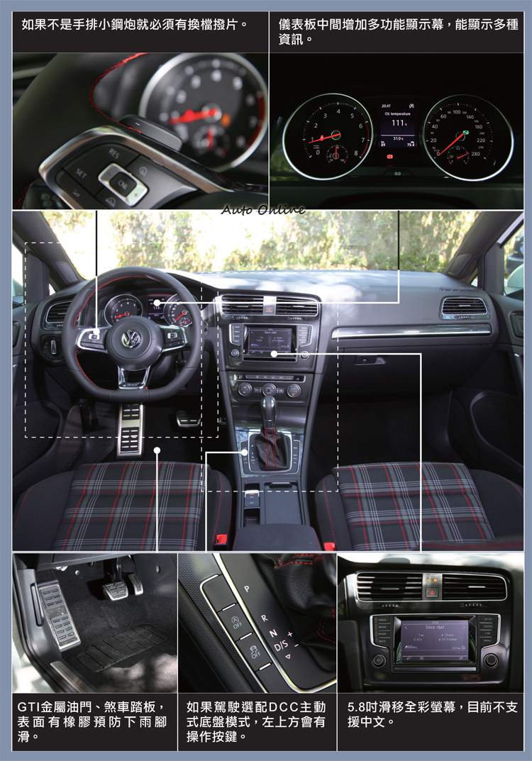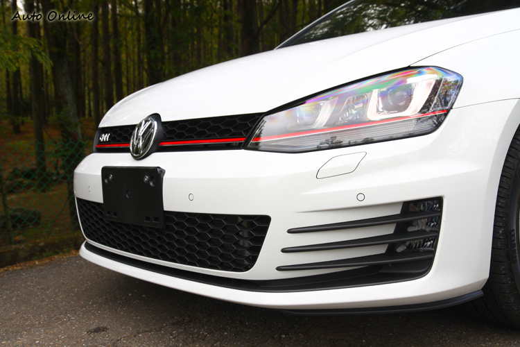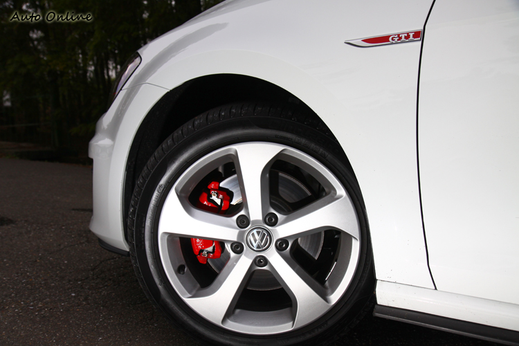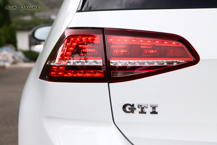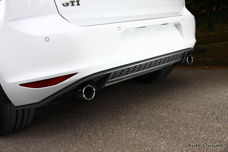 GTI專屬格紋再現第七代Golf GTI在外觀部分,透過小針美容提升整體殺氣。車頭水箱護罩上有專屬GTI字樣,蜂巢式水箱護罩加上運動化紅色飾條並與頭燈內部紅色飾條連成一線。 ![]() ▲GTI式樣保險桿加大氣壩面積,左右兩邊霸氣格柵式造型,裡面附有LED光源霧燈。![]() ▲車側葉子板GTI紅色字樣專屬銘牌,與鋁圈內艷紅煞車卡鉗相互輝映。![]() ▲車尾左右雙出排氣管,中間有賽車化下導流板(Diffuser)。![]() ▲尾燈燈具全LED化,下方有GTI專屬字樣。