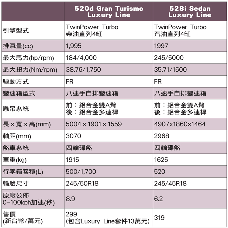 動力維持不變 八速手自排提升加速感![]() ▲動力不在這次改款重點中,528i最大馬力有245hp/5000rpm,最大扭力有35.7kgm/1250rpm。528i Sedan搭載一顆2.0升渦輪增壓汽油引擎,透過電腦程式的調校,與520i相同引擎本體,硬是多出61hp的馬力達到245hp/5000rpm,最大扭力有35.7kgm/1250rpm;運動化八速手自排變速箱加持下,齒比綿密有放大引擎馬力的效果,一點點渦輪延遲也被掩蓋過去。底盤為前鋁合金雙A臂與後鋁合金多連桿結構設定,腳上踩著245/45 R18(Luxury Line配備),看似笨重的5系列一樣能有不錯的操控表現。雖然5系列並非山道愛好者,但試駕過程不免俗的還是要開進山路測試一下。進入山區的第一步驟,將行車模式切換到Sport,儀表板瞬間轉為紅色,隨之而來油門反應靈敏、變速箱維持低速檔是激烈操駕最好的配菜。四缸渦輪增壓引擎讓5系列有很好的車身前後配重,轉向能維持很好的靈活度,完全感覺不出自身在操駕一輛接近5米的中大型房車,不得不佩服BMW在操控樂趣上的堅持。 ![]() ▲520d GT心臟為一顆2.0升柴油引擎,最大馬力有184hp/4000rpm與最大扭力38.76kgm/1750rpm。![]() ▲扭力看似突出的520d GT,礙於車身重量高達1915公斤,整體加速感受不及528i Sedan。