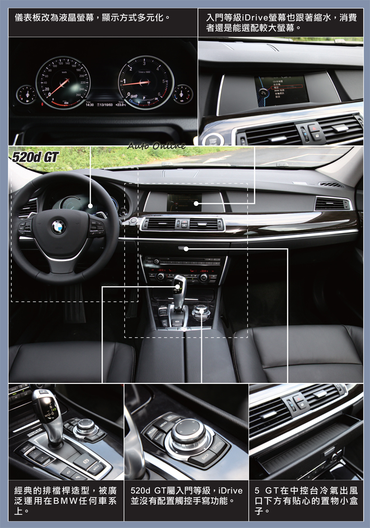 導入Luxury Line & Modern Line套件![]() ▲這次改款後的5系列,外觀改變幅度並不大。改款後的BMW 5系列,外觀的改變老實說,不仔細看很難看出端倪,其改款後最主要導入Luxury line以及Modern Line兩種套件共消費者選擇。 ![]() ▲改款後的528i Sedan導入Luxury Line套件,前保桿飾板會依造Line套件不同有材質上的差異。![]() ▲這次試駕的520d GT一樣搭載Luxury Line套件,車頭兩邊氣壩採鍍鉻飾條點綴(Modern Line為霧銀)。![]() ▲除了前後保險桿的飾條差異之外,前葉子板兩側會搭配專屬Line套件銘牌。![]() ▲520d GT有兩段式尾門開啟方式,有小面積或者大面積啟閉,就看消費者的使用需求。![]() ▲520d GT車門有與跑車相同的無框窗設計,在大型房車上面增添跑格氛圍。![]() ▲後保險桿以及排氣尾飾管在不同Line套件上會有不同呈現方式,另外,尾燈倒光條也在這次改款中重新排列。![]() ▲嚴格來說5 GT跟5系列只有車型車型名稱相同,但是在外型與底盤都跟5系列差異很大。