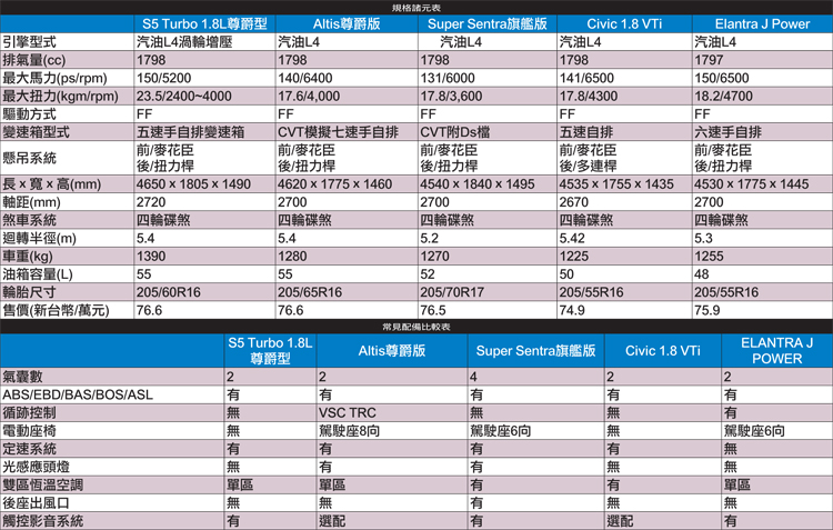 番外篇![]() ▲LUXGEN S5 TurboLUXGEN S5 TurboLuxgen S5 Turbo刻意調降價格,提高在國產中型房車中的競爭力。同級車中唯一使用渦輪增壓系統,造就它最大馬力150ps以及23.5kgm最大扭力,五速手自排系統加上偏向歐系車底盤設定,駕駛樂趣領先其他對手。安全配備上1.8L尊爵型只有前座兩顆氣囊,但是在主動安全上,有同級車沒有的Side View與Eagle View。![]() ▲TOTOTA Altis尊爵版TOTOTA Altis尊爵版一直都是台灣國產中型房車銷售冠軍的Altis,這次外觀使用歐規車型,整體感覺有年輕化的裝扮。內裝運用自家Lexus設計概念,增添國產車最欠缺的質感,不過在用料上還是感覺到塑味重了一點。Altis尊爵版有搭載循跡控制系統,安全性上大大加分。Altis打著牛頭牌的標誌,就算對手如何批評, 在部分消費者眼中地位屹立不搖。![]() ▲NISSAN Super Sentra旗艦版NISSAN Super Sentra旗艦版大改款的Super Sentra是五輛車中動力最小的最大馬力131ps/6000rpm與最大扭力17.8kgm/3600rpm,配上CVT無段變速系統,加速起來線性沒有太大樂趣。懸吊阻尼設定與座椅材質,整體乘坐感覺同級車中最舒適。輔助氣囊四具、定速巡航、雙區恆溫空調、後座出風口、觸控影音系統是對手中配備最豐富的車款。![]() ▲HONDA Civic 1.8 VTiHONDA Civic 1.8 VTi上市已經一段時間的Civic,在科技進步如此之快的年代,迎戰對手有點吃虧。引擎動力最大馬力141ps與最大扭力17.8kgm,VTEC加持下加速表現優異。底盤設定前麥花臣、後多連桿有別於其它四款車後軸的扭力桿,操控表現樂趣不在話下。內裝的配備有點陽春,但質感是對手中最亮眼的。![]() ▲HYUNDAI Elantra J PowerHYUNDAI Elantra J Power同樣推出一段時間的現代ELANTRA,現階段增添特仕版為銷售主力。Elantra J Power特仕版搭載高級JBL音響組,提供高品質聽覺饗宴。ELANTRA採六速手自排變速箱,最大馬力為150ps及18.2kgm最大扭力。安全配備有錢做雙輔助氣囊,同時也搭載ESP車身動態穩定系統。