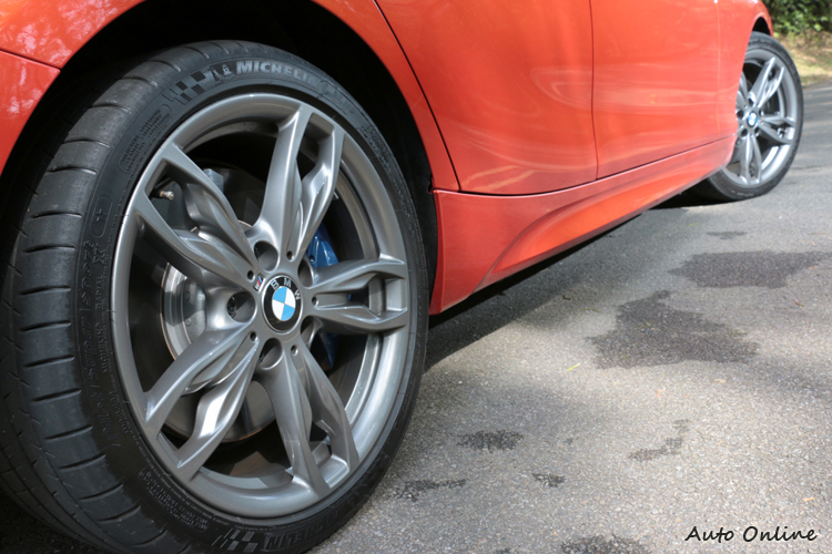 M135i底盤配備有M款主動式懸吊,這與125i M Sport的M款跑車懸吊差異在避震器阻尼會不會跟著動態行車模式做切換。當駕駛切換不同行車模式時,M135i的避震起阻尼會跟著一起改變,其乘坐感受在Sport+與Comfort經過路面跳動差異明顯,代表當駕駛切換到Sport+模式時,在山道上奔馳懸吊能提供更優異支撐表現。另外,M135i後差速器沒有搭載像是1M有配備的M款防滑差速器,它只有配備電子式制動式差速器,功能類似機械式LSD防滑差速器,作動方式是藉由控制後輪煞車調配動力分配達到同樣效果,如果要認真「胚」起來,效能還是無法跟傳統LSD相比。