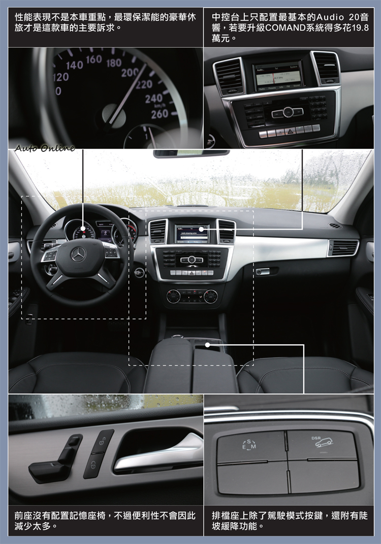 而一般消費者會比較在意的,可能是ML250中控台上的音響只給英文介面的Audio 20系統,而不是內建DVD、衛星導航的7吋COMAND多媒體系統,所以播放中文檔名MP3時會出現亂碼,螢幕不但只有單色,尺寸也較小。