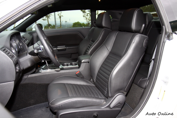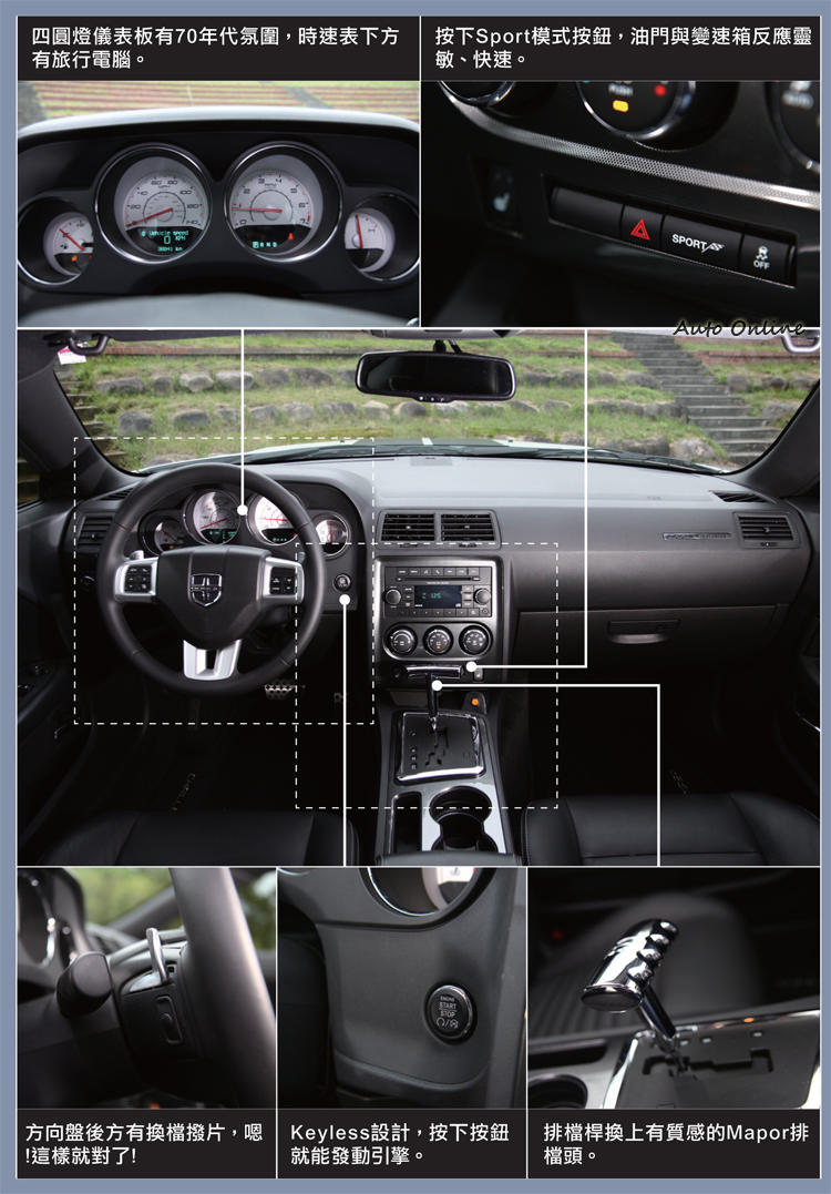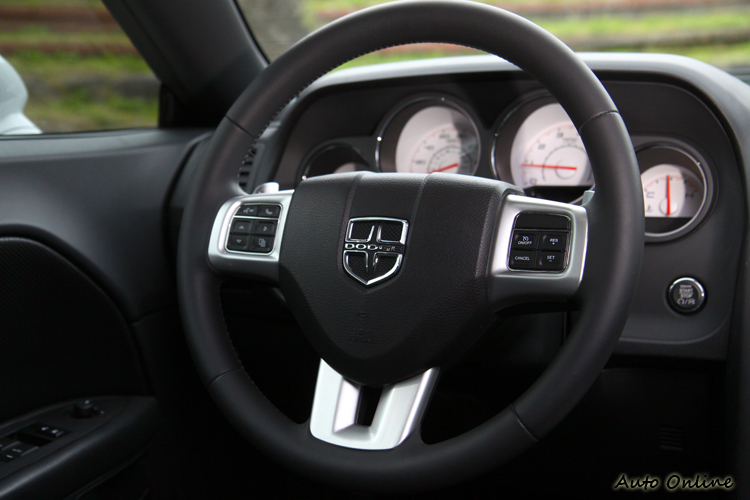進到車內,車內走的是簡潔風格,看得出美國人豪邁大氣個性。中控台沒有累贅的裝飾,直來直往是它固有本性。入門車型上,影音系統搭配的是傳統音響主機,有收音機、MP3、CD以及USB音源輸入功能。冷氣系統沒有琳瑯滿目的按鍵,簡單三顆旋鈕搞定車內空調系統控制介面。駕者者前方儀表採四圓式設計,這與70年代Challenger有異曲同工之處,Dodge維持經典還導入科技,時速表下方有多功能顯示幕,從方向盤上按鈕可以切換及設定車輛狀態,還有0-100km/h的加速測時。