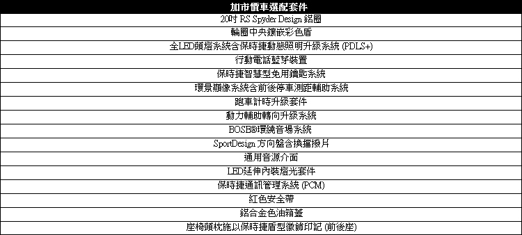 車頭變動較明顯 車身尺寸被拉長![]() ▲小改款Panamera改變重點主要集中在車頭,頭燈燈具輪廓修飾,使車頭有更大器的扮相。外觀部分,小改款Panamera改變重點主要集中在車頭,頭燈燈具輪廓修飾,去除不必要的折線,使車頭有更大器的扮相。燈具內使用氙氣頭燈作為光源,重新針對內部做排列,之前內部四環光條設計明顯,改款後以有點類似雙門跑車單圓設計導光條取而代之。前保桿上的日行燈,原本是與左右氣壩結合,改款後被獨立在左右大燈下方,光源採LED作為照明。前保桿加大下氣壩面積,氣壩內的橫柵造型從原本的一條改為兩條。 ![]() ▲試駕車款有選配20吋 RS Spyder Design 鋁圈。![]() ▲尾燈內架構重新排列,並導入全LED光源,增加車尾辨識度與安全性,牌照位置也不同。![]() ▲後尾門上雨刷移除,原位置更改為電動尾門開啟按鈕。