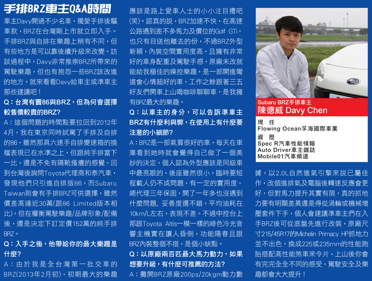 ![]() ▲訪談過程中,Davy非常推崇BRZ所帶來的駕駛樂趣。