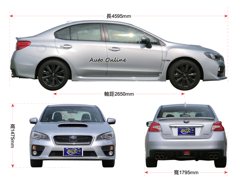 WRX車身尺碼為長4595mm、寬1795mm、高1475mm,軸距則為2650mm,與上一代相比,車長多了15mm,軸距長了25mm,A柱的距離前移200mm。這代WRX在外型上幾乎與WRX STI一模一樣,只有車身銘牌與車尾的大型尾翼不同。
