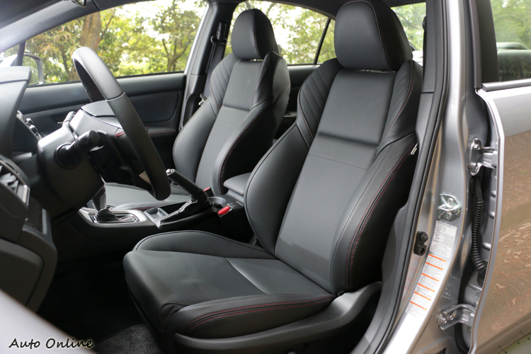 WRX前座兩張跑車座椅,以黑色皮面搭配紅色車縫線呈現跑跑格氛圍,腰部支撐性不錯,但大腿支撐性稍微弱了點,激烈操駕需要額外出力固定腿部晃動。