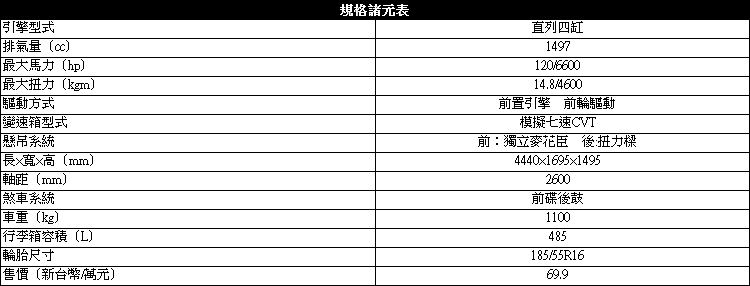 ▲同樣是120匹的最大馬力輸出,搭配CVT變速箱市區遊走相當順暢愜意,市區高速也沒有大太的問題。