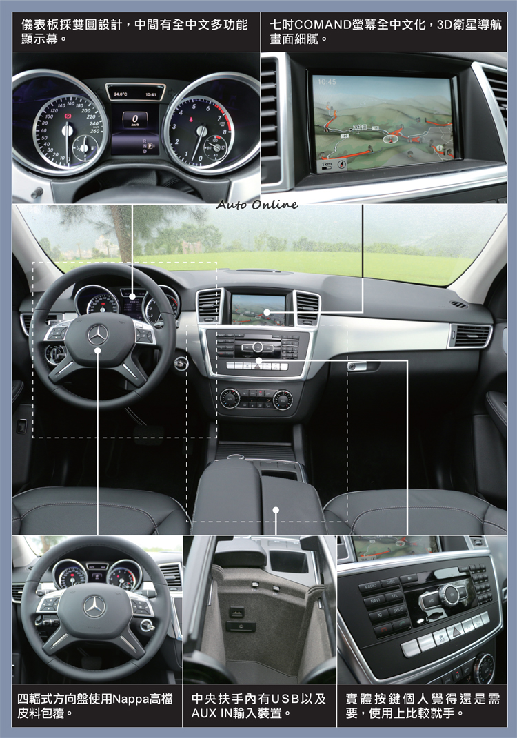 話說原廠想要將M-Class與性能、舒適兩者結合,實際體驗後,還是覺得比較偏向舒適。在未真正開始體驗前,發現中控台上方沒有行車模式切換按鈕,只有單一模式。方向盤上雖然有換檔撥片,但無法長久固定在單一檔位,如果降檔或升檔久不繼續操作,電腦會自動恢復D檔模式。居多總總就能看出ML 400主要還是以舒適趨向做設計。