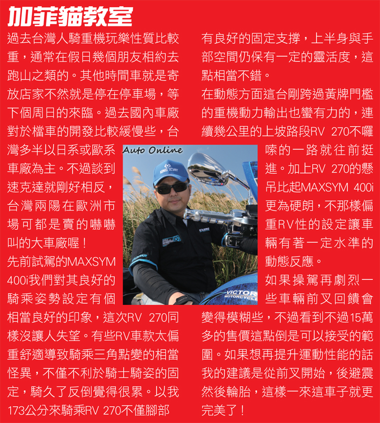 Max大機機時間![]() ▲良好的騎姿與適切的動力反應讓RV 270成為一台相當好手駕馭的車款。打造大型速克達對SYM其實不是一件陌生的事,早年SYM針對歐洲市場就推出相當多的大綿羊車款到歐洲,也獲得相當不錯的評價。只不過早期台灣並沒有開放大型重機,也讓許多好東西雖是MIT但卻無緣在台上市。 ![]() ▲CBS前後同步煞車介入的時機點不錯,不會忽然湧現讓騎士無所適從。