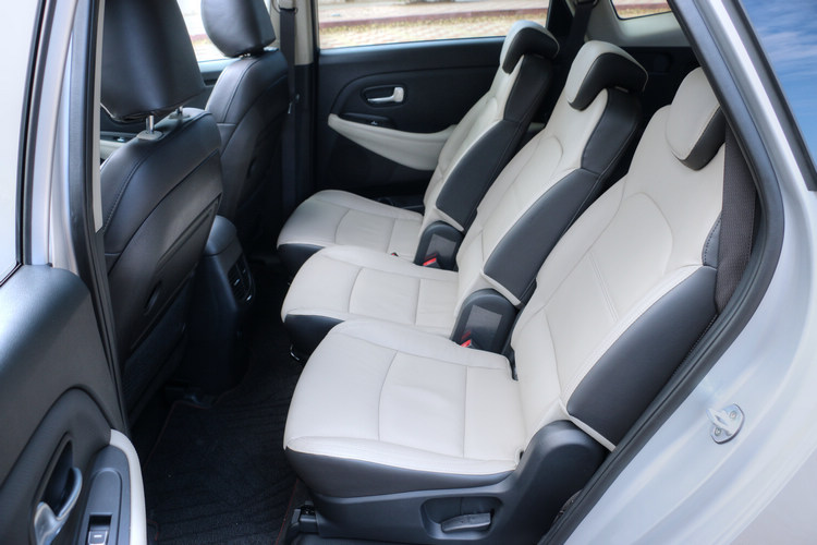 作為一部休旅車,座椅的機能設計格外重要,特別是國產化版本全車只有皮椅、腳踏墊等幾樣是台灣製造,這方面業者會更加用心。七座Carens都是旗艦車型,配備已是最頂規,使用的是5+2的配置方式。它的第二排座椅採用歐系MPV常見的3/3/3分離設計,且有獨立滑軌可以前後移動最多240mm,能讓第三排乘客進入更輕鬆,也可以讓後排乘客腿部更舒適。後兩排的座椅都能向前傾倒,形成平整的載物空間,縱使無法拆卸座椅,不過第三排座椅可在平常時摺疊藏於地板內,讓後方行李空間進一步擴充。