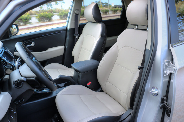 車室配色為象牙白與黑色構成的雙色調,操作介面配置將上層的行車資訊和下層的操作區明顯區隔開來。Carens中階以上車型都配有Push Start & Smart Entry系統和換檔撥片,定速及限速系統則是全車系標配,而ECO節能系統同樣也是車系的標配項目。方向盤有四向調整設計,上面具備了藍芽免持、音響、定速等操作功能,並能控制儀表內的旅程電腦顯示及設定,同時,Flex Steer轉向力道可變駕駛模式(舒適/一般/運動)的切換鍵也在這裡,不過必須注意未來的組裝品質,在這批試裝車上,一些按鍵都必須用點力壓下去才有作用。