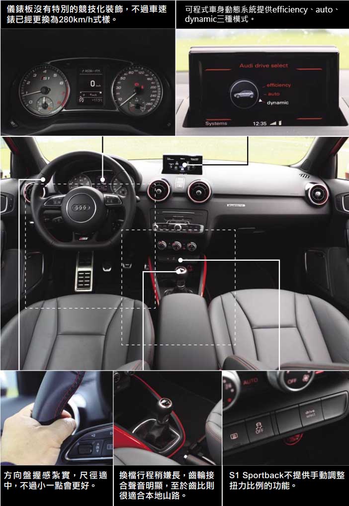 尺碼迷你,231ps的動力在S性能家族中也算迷你,引擎容積效率換算起來115.5ps/L,和近年其他性能車相比,也排不進前段班。但EA888引擎的潛力當然遠遠不僅於此,AUDI刻意不讓動力太過緊繃的用意,是將重點聚焦在優異的底盤設定上,搭配其他對手所欠缺的輕量車身優勢,讓SUBARU WRX STi等相同價格帶的性能車,很難具備S1 Sportback這樣靈巧的特性。