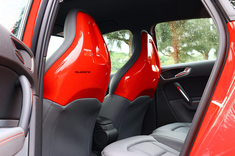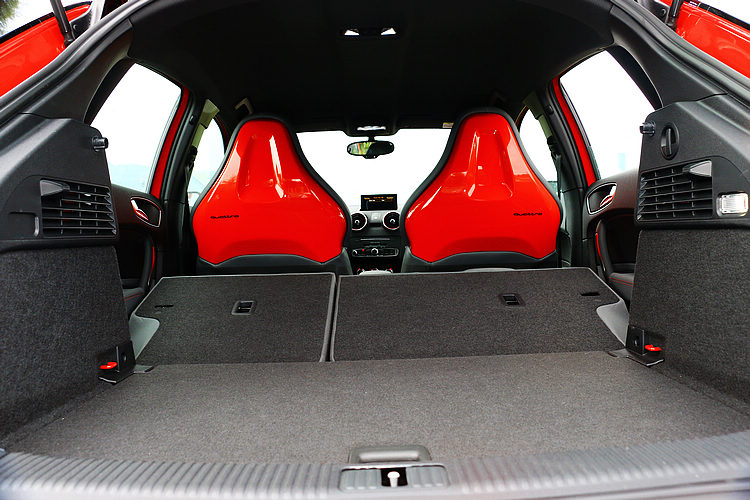 作為個性訴求鮮明的鋼砲車,車尾安裝了特殊造型專屬尾翼,搭配鋁合金塗裝車側後視鏡蓋,看來格外搶眼。此外,試乘車還升級為18吋胎框,圈內可見標示S1廠徽的紅色煞車卡鉗,加上後門下緣的quattro字樣,以及鍍鉻雙出尾管等運動化配備,街頭巧遇應該很容易辨識。