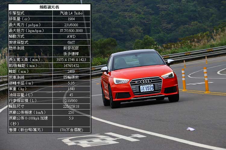 quattro傳動系統的幫助的確很大,搭配S1車系專屬的多連桿後懸吊在下著小雨的山路上快速奔馳,無視溼地急彎,四輪依舊伏貼,回饋給駕駛的資訊也異常清晰,當然這部份也歸功於它所選配的18吋胎。重踩煞車不會給人所謂的撞牆感,車子減速的過程都在預期內,而且車身穩定系統作動時幾乎無感。激駕時偶爾察覺車尾比車頭更靈活,有向彎外擺的傾向,原廠調校似乎刻意用類似拉力車的動態來縮小進彎角度,但也別擔心會被嚇到,因為整個車尾外移過程都很漸進。