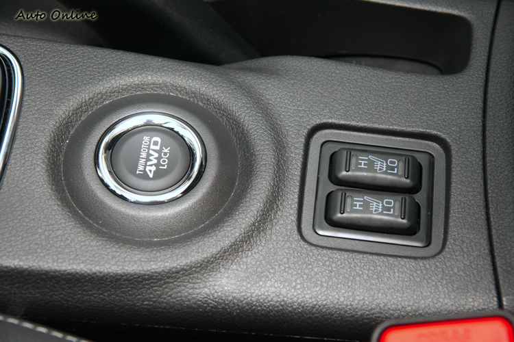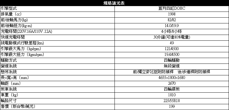 系統配置與運作觀念![]() ▲動力上大致具有2.0L渦輪的水準,不過動力反應比較線性。Outlander PHEV的混合動力系統配置方式為,車頭搭載2.0L排氣量代號「4B11」的MIVEC直列四缸引擎,可輸出121hp/4500rpm最大馬力與19.4kgm/4500rpm最大馬力,而在車子前、後軸則各配置一具電動馬達,最大馬力、扭力輸出分別為82hp/14.0kgm與82hp/19.9kgm。透過S-AWC四驅系統的管理就形成四驅形態。 ![]() ▲PHEV系統以2.0L MIVEC引擎與前/後軸的兩具馬達所組成。![]() ▲鍍鉻橫柵水箱罩與下氣壩看起來比國產2.4L車型更有質感。![]() ▲四驅系統提供鎖定模式提高克服惡路能力。