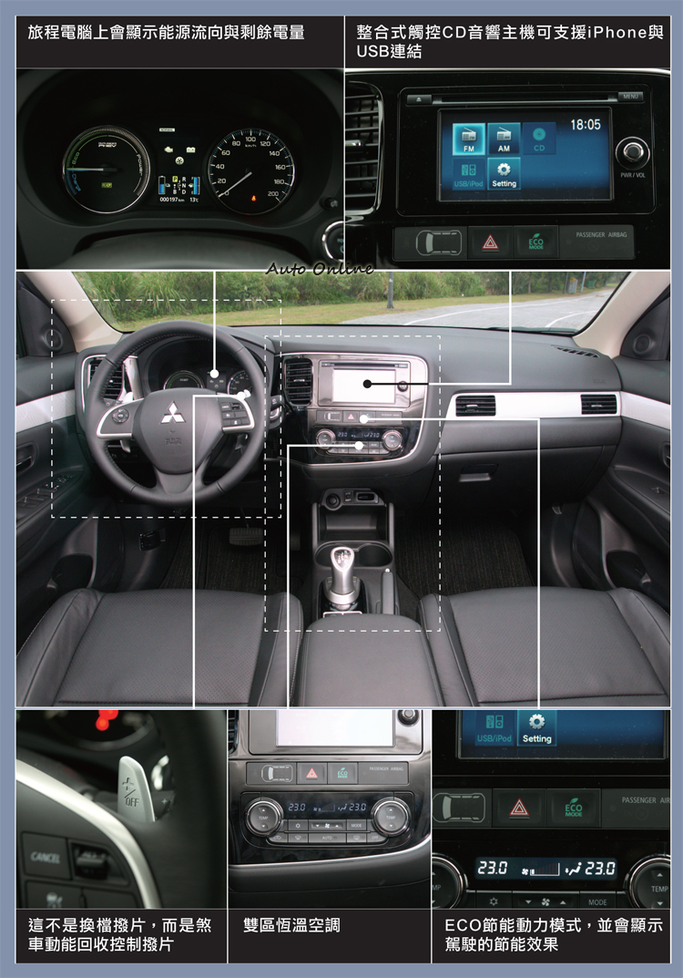 ![]() 而像Outlander PHEV這樣的插電式混合動力,電動馬達就是主角,若是以都會居住、上班的通勤生活形態而言,晚上在家充飽電,第二天上下班路程大概九成以上都是純電行駛(原廠公布的電池飽電狀態下純電行駛里程為49公里,跟我們實際試駕測試的結果差不多),引擎的運作耗油極低,達成車廠公布的54.6km/l油耗值不是難事,說句玩笑話車主可能不用太管油價反而應注意電價。節能、減少廢氣排放在重視環保的現在都是值得我們關注的。