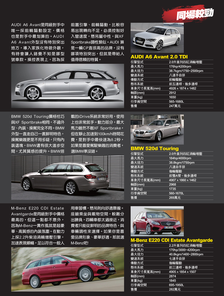 如果將同規格旅行車對手AUDI A6 2.0 TDI、BMW 520D與M-Benz E220 CDI,JAGUAR XF Sportbrake與BMW相同,價格最高為M-Benz,最划算則是AUDI。不談價格,各有各的優勢,操控來說BMW佔上風,論質感M-Benz絕對有贏面,論CP值高AUDI絕不輸人,論美感JAGUAR則當仁不讓。但最主要就是要看消費者對於車的想法,這樣才能找到一輛最適合自己的旅行車。