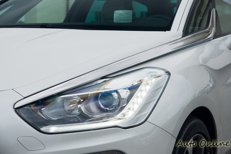 頭燈不像概念車那般細長,但眼神依舊銳利。標配具頭燈射角自動水平調整功能的遠近雙模式XENON氣體放電式頭燈,並具有主動轉向與自動遠近燈切換功能。LED日間行車燈與霧燈間以「ㄈ」字形的導氣孔來整合,讓雙層設計的水箱罩、下氣壩又有了連結。不過車頭最吸引人目光的,則是從頭燈一路延伸至車側三角窗上的「軍刀」造型鍍鉻飾條。