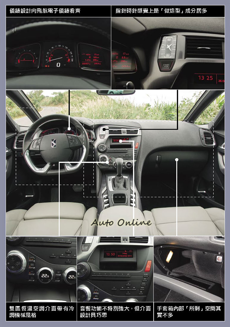 影音部分DS5相對來說顯得較為薄弱,配備CD/MP3音響可透過USB/Aux-in端子連結來播放mp3與外部音源音樂,也有藍芽通訊功能。倒車顯影屬於選配,eMyWay導航系統同樣是選配且只顯示英/法文,對國內消費者來說實用性不高。後座腿部空間在同級中僅算合格,甚至是被車身更短車款的空間表現逼近,手套箱空間被切割佔用太兇與車門置杯架佔用不少置物槽空間也有些可惜。