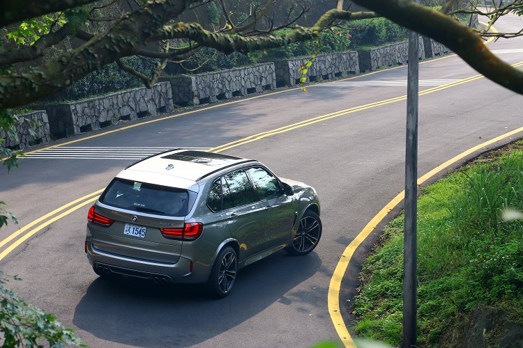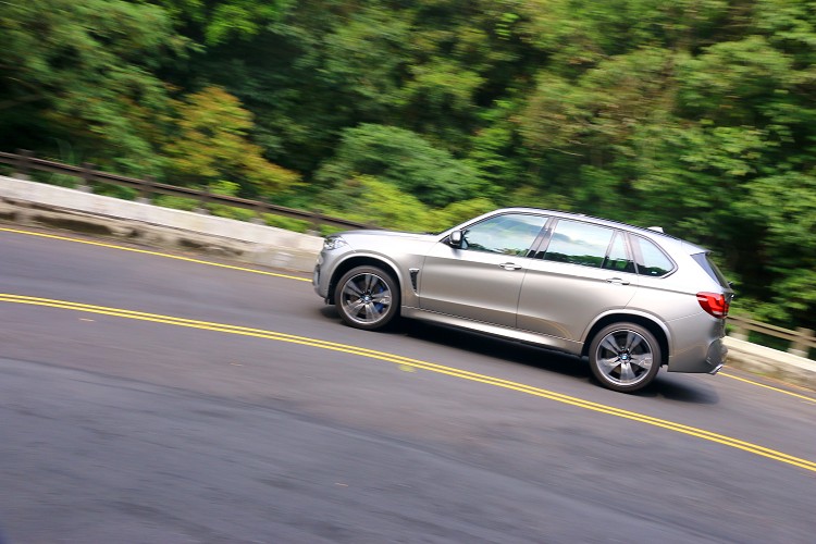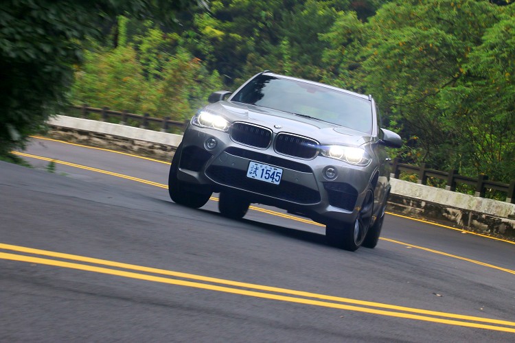 以街道版賽車出發點的BMW X5 M,比一般X5車身高度分別降低前14mm、後17mm,搭配 M款專屬的輔助彈簧,在市區道路行駛不會出現水土不服,就像一般的大型SUV,只是懸吊偏硬朗些,就算懸吊在Comfort模式下,還是感受到比一般X5來得剛硬許多。隨著車速漸快,原本感覺硬朗的懸吊轉為優勢,高速的穩定不受車身重心較高的SUV影響,而且有越快越穩的跡象。前方道路轉換為山路,把轉向、懸吊、動力、變速箱都切換到Sport Plus,第一時間能明顯發現方向盤回饋力道減弱,需要用較多的力氣轉動,碰到連續彎道顯得吃力,只好把模式切換到Sport增加回饋力道。